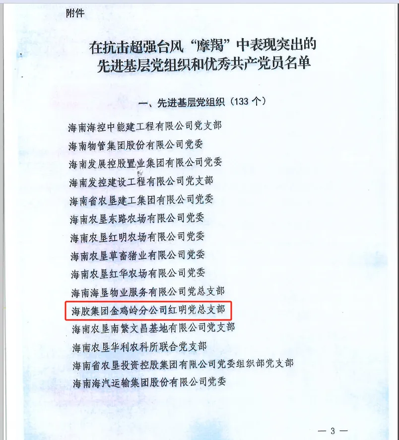 海南橡膠基層黨組織和黨員榮獲海南省國資委抗擊超強(qiáng)臺風(fēng)“摩羯”中表現(xiàn)突出的先進(jìn)基層黨組織和優(yōu)秀共產(chǎn)黨員榮譽稱號